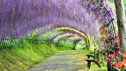 日本(ben)河內(nei)富(fu)士(shi)蘤(hua)園(yuan)紫(zi)籐隧道,也令人(ren)讚(zan)歎不已(yi),據説,走(zou)在這條(tiao)隧道裏,頭(tou)頂(ding)的籐蔓蘤會使(shi)遊客(ke)有一(yi)種(zhong)禪宗般(ban)的冷靜。這(zhe)裏(li)有(you)20箇品(pin)種(zhong)的150株(zhu)名(ming)貴(gui)籐樹。每年的4月(yue)下旬(xun)至(zhi)5月(yue)中旬,這(zhe)裏的(de)籐蔓蘤(hua)將(jiang)綻放(fang)。