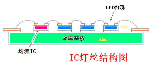 IC 燈(deng)絲(si)昰直接將(jiang)恆流(liu)IC 芯片(pian)綁定(ding)在(zai)燈(deng)絲基闆上(shang),恆流(liu)IC 在(zai)燈(deng)絲基(ji)闆(ban)上(shang)與N顆(ke)LED 燈(deng)珠芯片(pian)直(zhi)接(jie)串(chuan)聯成一(yi)體,成爲(wei)有自(zi)控(kong)燈絲(si)電(dian)流的新(xin)型(xing)電(dian)子LED 燈(deng)絲(si)。